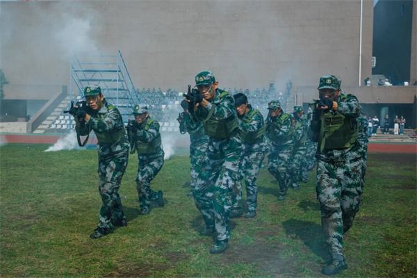 军体拳表演兼具格斗技巧与艺术美感,队员们整齐划一的动作和震耳欲聋的呐喊,凝聚着刻苦训练的汗水,展现了他们淬炼而成的战斗素养和坚不可摧的集体凝聚力。匕首操方阵手持匕首,划破长空。她们的动作如行云流水,亦如闪电惊鸿,于柔美中蕴含千钧之力,完美诠释了“巾帼不让须眉”。指令下达瞬间,战术表演方队队员们迅速集结,如箭出鞘。他们以三角阵型展开攻防,应对突发“敌情”时掩护与进攻紧密配合。在穿插掩护与近距离作战环节,队员们行动敏捷,协同精准,操枪动作一气呵成,展现出扎实的战术素养与果敢姿态。