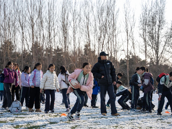 初雪过后,橄榄球场成了天然的游乐场。志愿者与教师组织同学们分组开展打雪仗、堆雪人、传接球等活动。“这个球形状好奇怪,还沉甸甸的,一点都不听话。”初次接触橄榄球的李沐阳,起初有些困惑:“后来我发现不能太用力扔,要轻轻送出去,朋友接住球的瞬间,我成就感满满!”