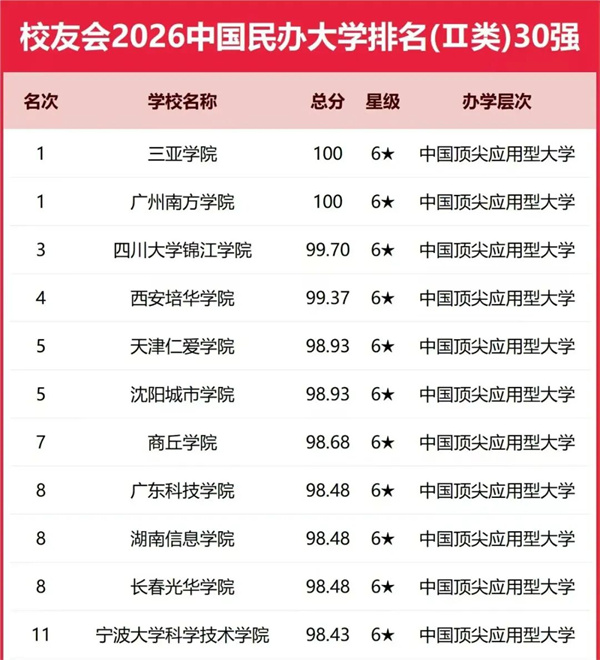 1月12日,全国第三方大学评价机构艾瑞深校友会网(Cuaa.Net)发布校友会2026中国民办大学排名30强。在榜单中,沈阳城市学院位列中国民办大学第五名,较2025年又进一步,并获评六星级中国顶尖应用型大学。