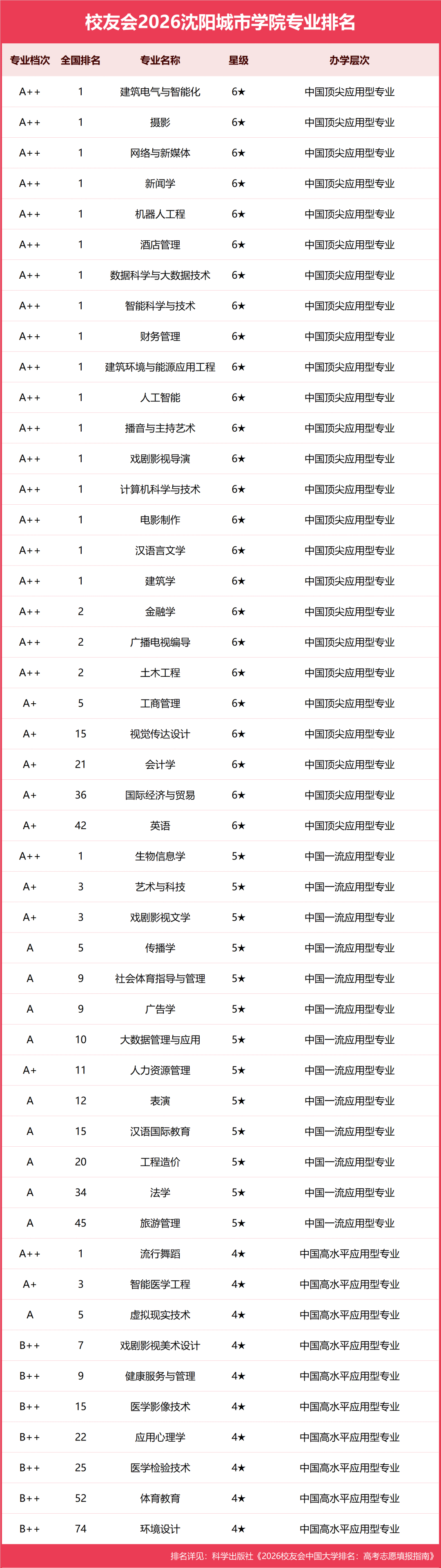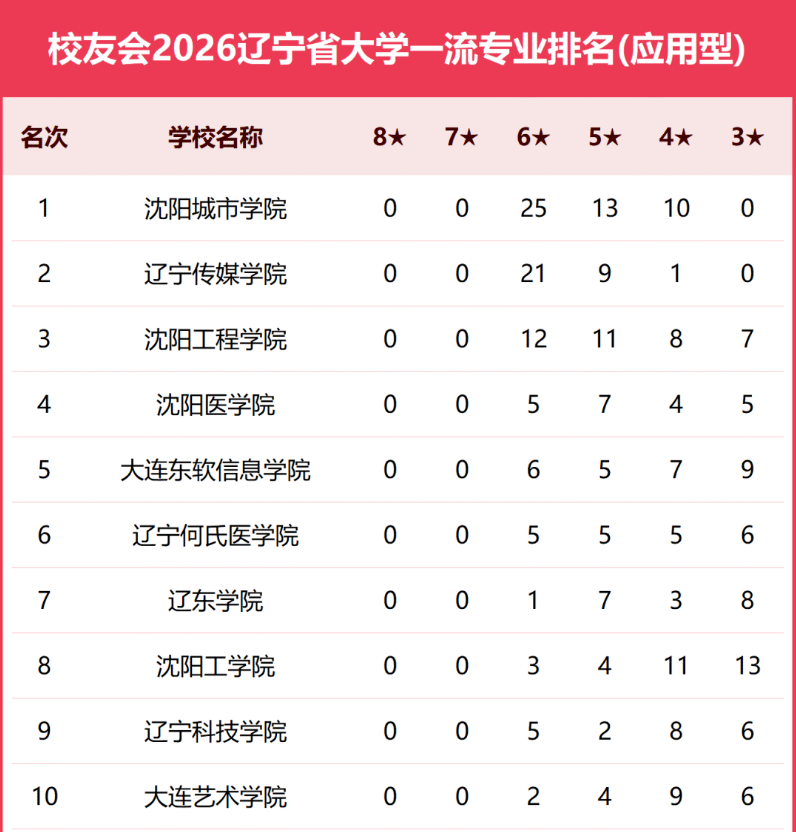 4月12日,全国第三方大学评价机构艾瑞深校友会网发布“2026辽宁省大学一流专业排名(应用型)”。沈阳城市学院凭借25个中国六星级专业(6★),13个中国五星级专业(5★),10个中国四星级专业(4★),荣登校友会2026辽宁省大学一流专业排名(应用型)第1名。