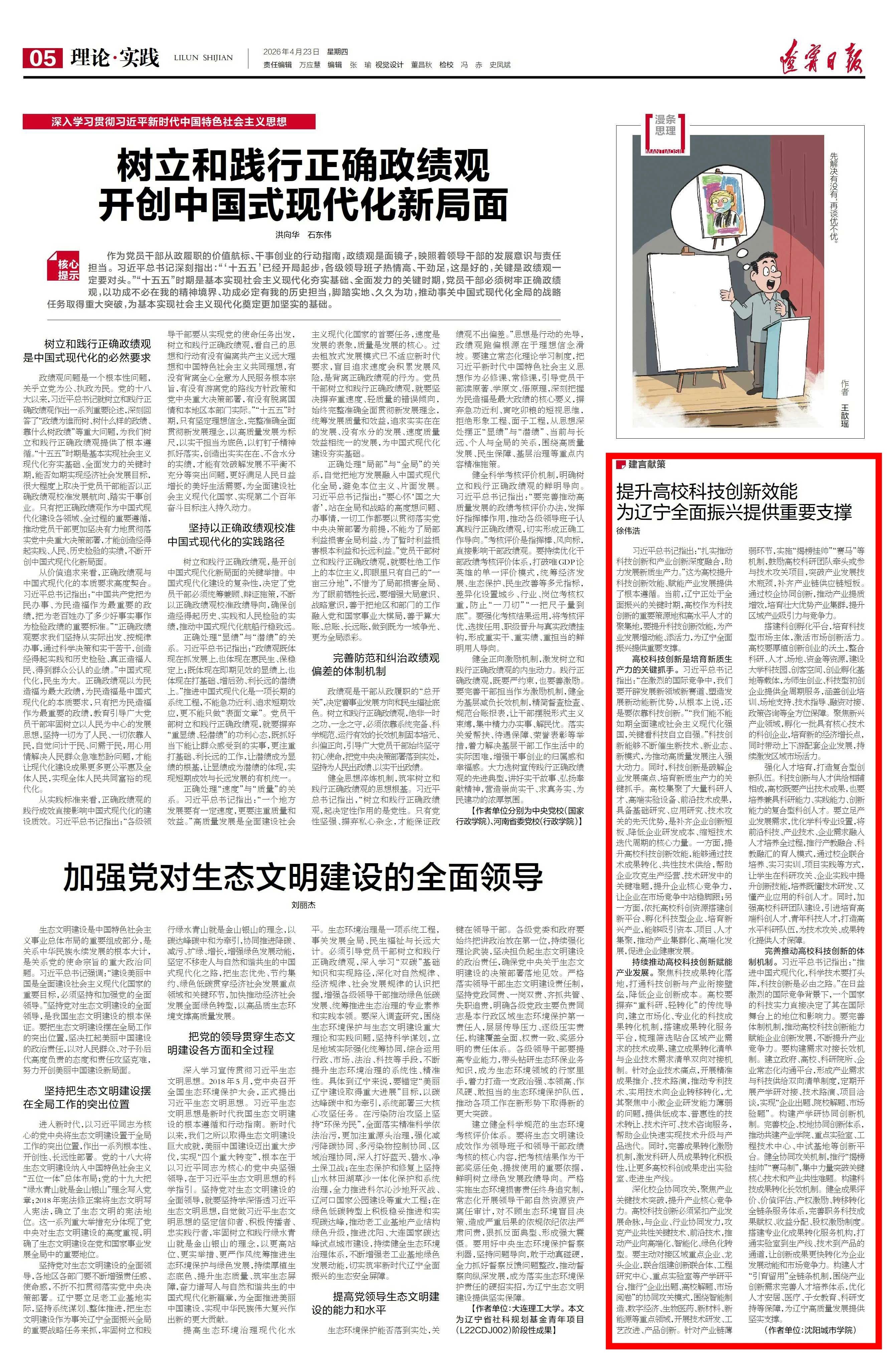 4月23日,辽宁日报“理论·实践”版面刊发沈阳城市学院校长徐伟浩教授理论文章《提升高校科技创新效能 为辽宁全面振兴提供重要支撑》。文章从 “高校科技创新是培育新质生产力的关键抓手”“推动高校科技创新赋能产业发展”“完善推动高校科技创新的体制机制” 三大维度,系统阐释了高校作为科技创新策源地,在破解企业技术痛点、突破产业发展瓶颈、集聚创新要素中的重要作用,为辽沈地区高校与产业深度融合、共促高质量发展提供了理论参考与实践路径。