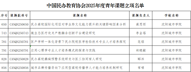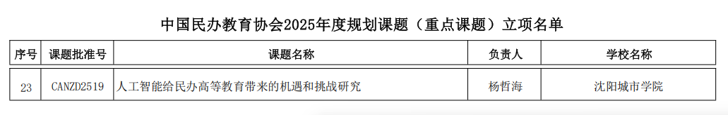 近日,中国民办教育协会公布了2025年度规划课题(重点课题、青年课题)立项名单。沈阳城市学院共有7项课题成功获批立项,这是学校在科研创新领域取得的一项重要进展。这批课题将有力推动学校深化产教融合、提升应用型人才培养质量的相关研究,为后续工作奠定了坚实基础。