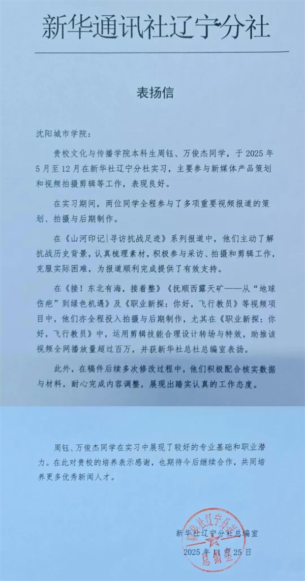 表扬信中指出,周钰、万俊杰同学于2025年5月至12月在新华社辽宁分社实习期间,“展现了较好的专业基础和职业潜力”。两位同学全程参与了多项重要视频报道的策划、拍摄与后期制作,在《山河印记寻访抗战足迹》系列报道中,“主动了解抗战历史背景,认真梳理素材,积极参与采访、拍摄和剪辑工作,克服实际困难,为报道顺利完成提供了有效支持”。信中特别提到,在《接!东北有海,接着整》、《抚顺西露天矿——从"地球伤疤"到绿色机遇》及《职业新探:你好,飞行教员》等视频项目中,他们全程投入拍摄与后期制作,展现出踏实认真的工作态度。