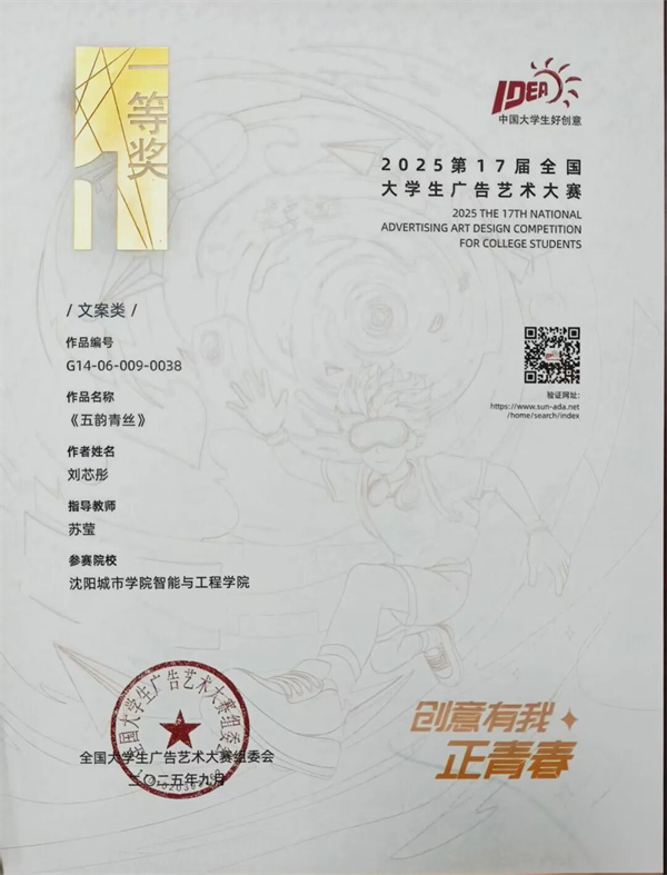 智能与工程学院计算机科学与技术2023级5班的刘芯彤说:“这份荣誉,不仅是对我个人创意的肯定,更是对传统文化与现代品牌结合这一方向的鼓舞。全国一等奖是一个珍贵的终点,更是一个崭新的起点。它让我更加坚信创意的力量与文字的温度。未来,我将带着这份荣誉与期待,在老师们的指导下,继续深耕于创意与文案的世界,探索更多有深度、有温度的传播可能。”