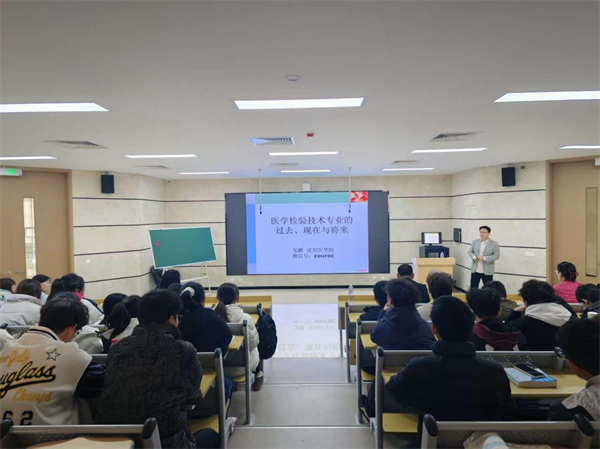 邹鹏教授沈阳医学院重点引进人才,曾留学日本并获博士学位,长期深耕医学检验技术领域的教学、科研与实践工作。讲座中,邹鹏教授从医学检验技术的“过去、现在与未来”展开,用清晰的逻辑与生动的案例串联起专业发展脉络。他首先回顾了医学检验技术的发展历程,从传统手工操作到自动化仪器应用,再到如今的智能化检测时代,强调技术革新始终是推动行业进步的核心动力。