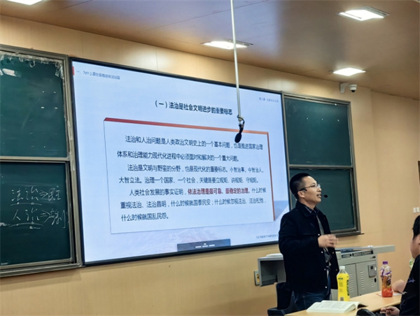 彭向阳:围绕“全面依法治国”这一主题,从坚持中国特色社会主义法治道路、建设中国特色社会主义法治体系、加快建设法治中国三个方面展开,融入法制法治人治辨析、依法治国与以德治国关系讨论等互动问题,助力学生深化理论理解,引导大学生牢固树立法治观念法治意识。