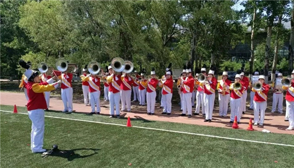 行进管乐团以小号、长号、大号、长笛、单簧管、萨克斯、行进鼓等乐器为载体,选取经典管乐作品为曲目,采取个人独奏、小组配合、团队组合演奏的方式进行排练,使每名学生都有机会学会1种乐器,演奏2首曲目,每学期举办一次艺术展演,根据个人的演奏技能和团队演出效果。