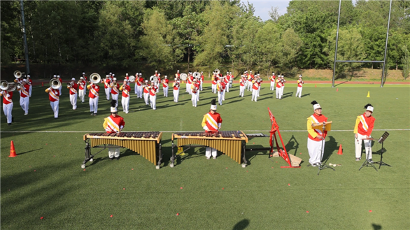 经过五天的选曲、编制方案、部署排练计划、敲定演出服装、录制视频地点、时间等一系列准备工作后,5月15日比赛集训正式开始。学校需要在6月放假前提交参赛视频,三首曲子,三个方案,时间紧任务重。每晚,随着一期操场灯光的开启,就会响起音乐的声音,夜深露重,队员的乐器上挂满了水珠。为了弥补零基础队员业务上的缺失,学生们每晚从五点半排练到十点左右,周末全天集训。同学们都自发在闲暇时抓紧到乐团练习,生怕拖了团队的后腿。