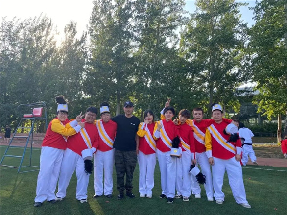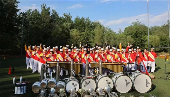 每次训练结束都集体呐喊校训“我行 我能”,是绿岛行进管乐团的传统,正是校训精神,支撑着师生们一路披荆斩棘。队员们在准备过程中遇到了很多困难,室外训练受天气影响,遇到雨天大家只能暂缓训练,雨停后大家不顾寒冷,立即投入训练。录制前一天调试设备时,大家发现原本的录制方向无法收全画面,他们便紧急转换图形方向,队员们不能再依赖每天训练时标在地上的点位去走,只能对标身边的同学,加大了走队形的难度。录制当天风很大,摄像机没办法放在三脚架上,只能由摄影师站在桌子上举着相机。另外,因为第一次参与线上比赛,对视频的录制不熟练,开始几次录制的视频都因为角度问题作废。一遍一遍录制对队员的体力、心态都是极大的消耗。这样的情况下,每名队员并肩作战,不喊苦不喊累,抬头挺胸地录制到满意为止,交出了最好的答卷。