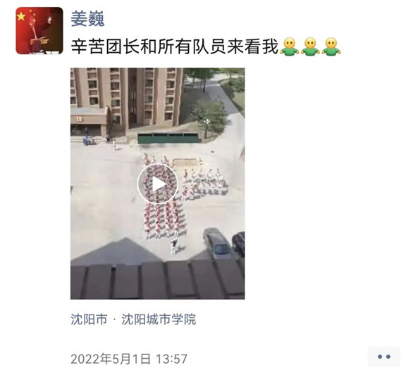 在校隔离期间,行进管乐团的队长刘光灿组织所有队员,身着比赛队服,扛着乐器,迈着整齐的步伐来到了隔离宿舍楼下。“你想听啥?我们给你演奏。”刘光灿对着楼上呼喊。队员们决定演奏一首《凯旋》送给平安返校的姜巍老师,也借此机会提升大家的凝聚力,为接下来的比赛预热。