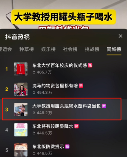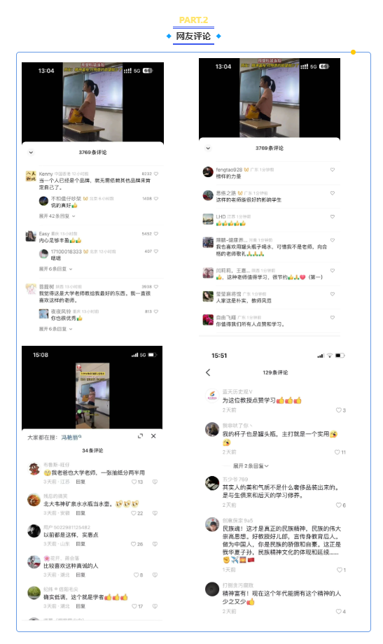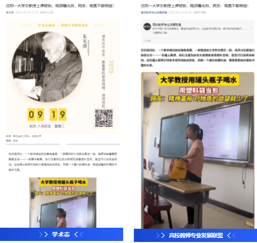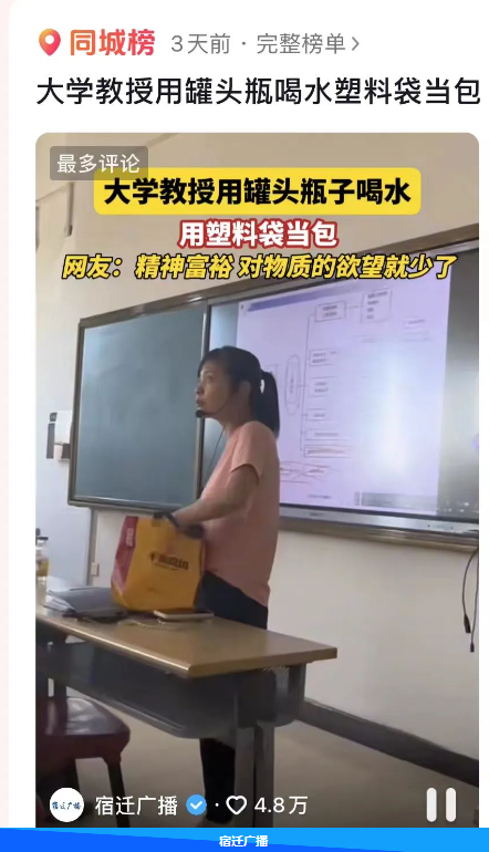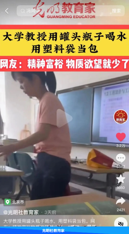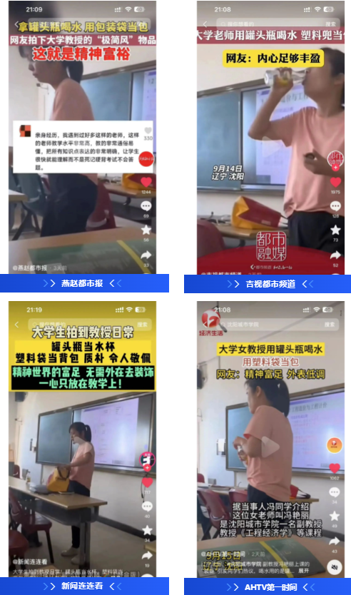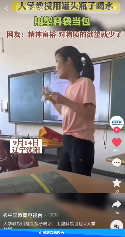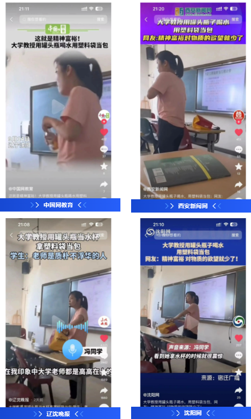 近日,沈阳城市学院工程造价系主任冯艳丽用罐头瓶喝水、用打包袋装书的视频火遍全网。截至9月19日全网总体播放量超1.1亿,点赞量超1700万,话题“大学教授用罐头瓶喝水塑料袋当包”连续两天冲入抖音同城榜前三名。该新闻被11家粉丝量超过100万的媒体平台账号转发,其中包括中国教育电视台官方账号、中国网教育官方账号,光明日报旗下媒体账号等央级媒体转发。网友纷纷点赞说“精神富裕,对物质的欲望就少了”“这就是榜样的力量”。