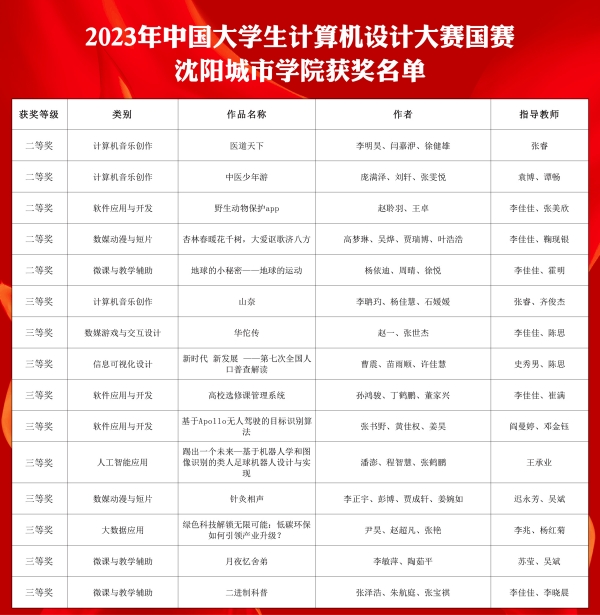 近日,2023年中国大学生计算机设计大赛国赛发布竞赛结果,沈阳城市学院创新创业教师团队指导的学生参赛项目荣获二等奖5项,三等奖10项,获奖总数位列辽宁省民办高校第一名。