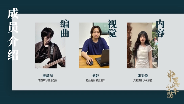 该小组成员首次以中医药为主题进行创作,由于对中医药理解不深,遇到了很多困难。同学们联系了一位中医药老师,去了解中医药的历史、传承以及中西文化,从多个角度领悟中医药的魅力,获得了许多创作灵感。在前期设计歌曲时,他们尝试了多种风格,最终将歌曲定为轻松、悠扬的说唱风格。该组成员在张睿老师的指导与建议之下,融合了戏腔等元素,使歌曲听上去丰富、动感、流畅。他们说:“参加比赛平时的积累很重要。在创作时不仅仅要表达故事和主题,更要想清楚创作本身的意义,作品背后能传递出哪些力量、代表着哪些文化等。除此之外,突破和越级也很重要。要相信自己可以,不能给自己设限,只要努力尝试、为之付出,就不会让自己留下遗憾。”