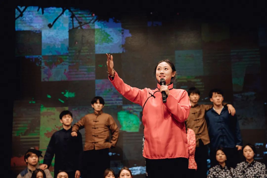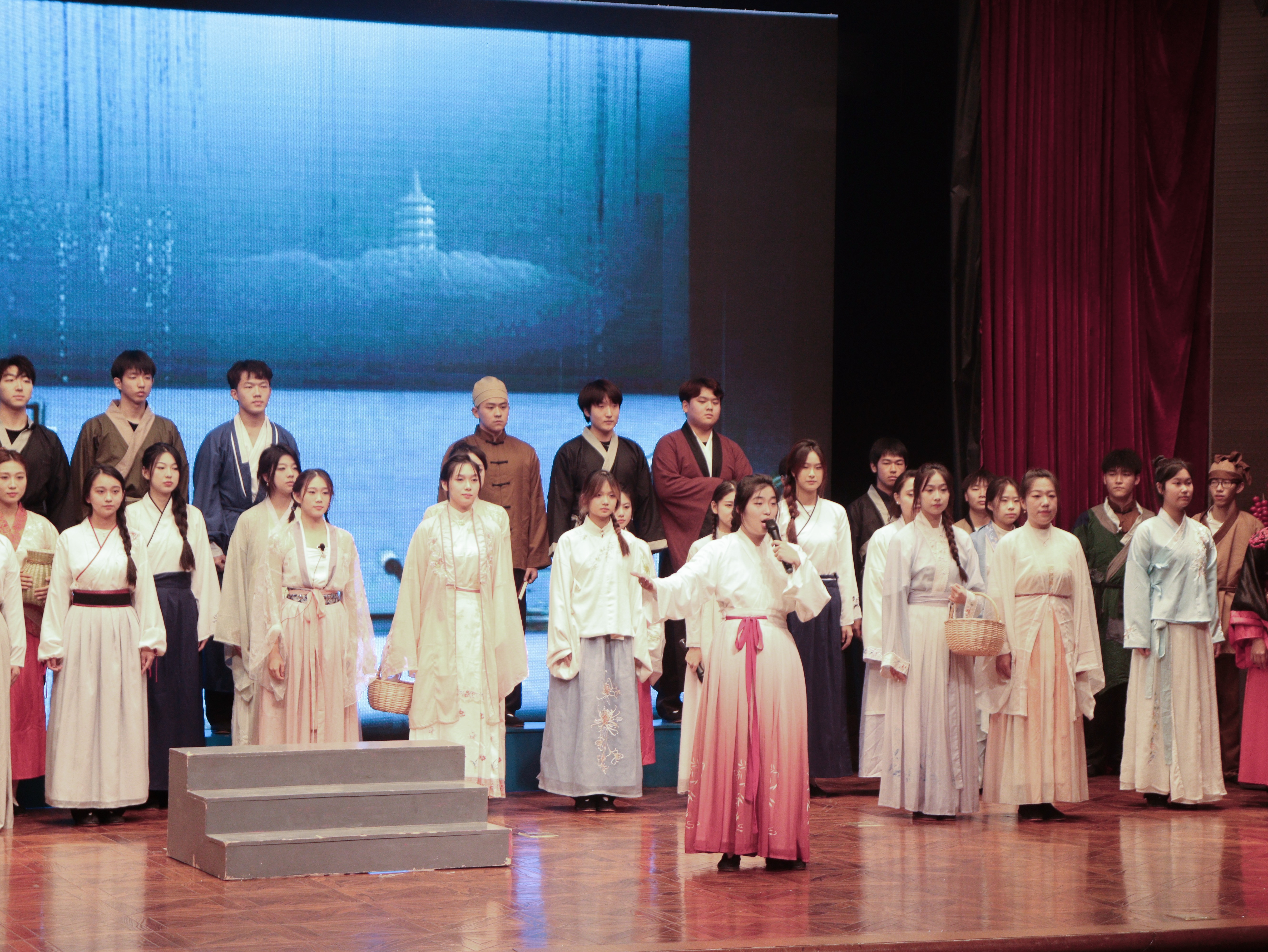 现场的表演中,同学们身着明朝服饰,手拿各式各样的道具,将音乐和歌剧舞台艺术巧妙结合,真实再现了运河上的劳动场景,展示了运河河畔的人间烟火气,让观众仿佛亲身参与其中。两位主演在舞台上通过优美的旋律、情真意切的唱词和深情的演唱,将正义泼辣、机敏果敢的水红莲和心地善良、刚毅正直的秦肖生的形象立体生动地树立在舞台上,让观众和他们同悲喜,共命运。