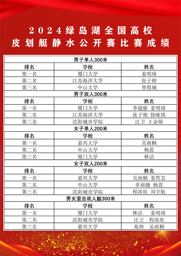 本次比赛分为200米直道竞速和300米直道竞速,组别为男子单人、双人皮划艇300米,女子单人、双人皮划艇200米,男女混合双人皮划艇300米。经过激烈角逐,最终,厦门大学代表队、江苏海洋大学代表队、中山大学代表队获男子单人300米冠亚季军;厦门大学代表队、江苏海洋大学代表队、沈阳城市学院代表队获男子双人300米冠亚季军;嘉兴大学代表队、中山大学代表队、厦门大学代表队获女子单人200米冠亚季军;嘉兴大学代表队、中山大学代表队、沈阳城市学院代表队获女子双人200米冠亚季军;厦门大学代表队、沈阳城市学院代表队、嘉兴大学代表队获男女混合双人艇300米冠亚季军。