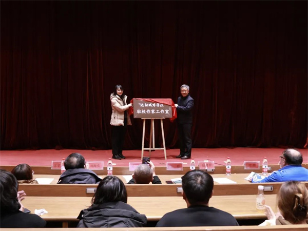 文化与传播学院院长赵慧平、党总支书记兼常务副院长王姣,为沈阳城市学院驻校作家工作室揭牌。