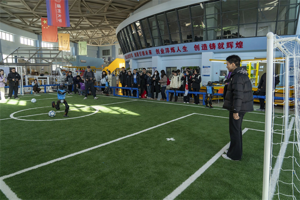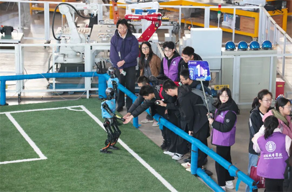 在大创工场的类人足球机器人场地,张茂伦同学正在亲手操控机器人。“一开始我还有点紧张,动作不太流畅,但整个操作过程其实非常流畅!”他兴奋地分享了自己的体验,“如果再多练习几次,我肯定能操控得更‘丝滑’。”最让张茂伦惊叹的是机器人的智能表现。“它摔倒后,居然自己‘噌’一下站起来了,那一刻我真的忍不住惊呼:太厉害了!”这种科技的力量,让他特别震撼。当被问到这次体验对未来的影响时,张茂伦认真地思考起来。“平时课余时间,我就喜欢捣鼓些小发明,这种动手实践特别锻炼思维。经过今天的体验,我觉得人工智能这个领域特别吸引我。或许,这就是我未来想要探索的方向。”
