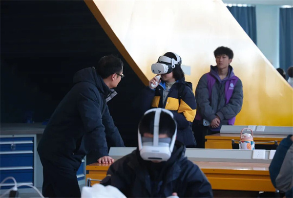 与此同时,大创工场的另一端,同学们正头戴VR眼镜,开启了一场沉浸式虚拟探索。袁亿航同学双腿慢慢向前,手臂随着虚拟场景中的画面左右转动,仿佛真的置身于一个神奇的世界中。 “我现在好像在一个很未来的电影院里面看电影,周围的座椅和大屏幕都特别真实,连地板的纹路都能看清楚!“他边说边伸出手指,试图触摸虚拟环境中的物体,“之前我也玩过一些VR设备,但这次的清晰度和流畅度明显更好,而且一点都不会头晕。” 最让人惊喜的是,这次体验还激发了他对未来的思考,“我可能会把虚拟现实技术作为以后的学习方向。”