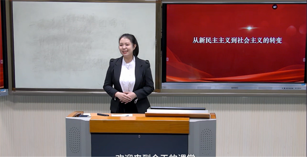 韩琳慧老师主讲的《毛泽东思想和中国特色社会主义理论体系概论》本次获奖课例“从新民主主义到社会主义的转变”,以开国大典影像导入,引用习近平总书记重要论述,以“是什么—为什么—靠什么—怎么办”为逻辑主线,结合详实史料与理论分析,清晰阐述了从新民主主义走向社会主义的历史必然,学理扎实、富有感染力。