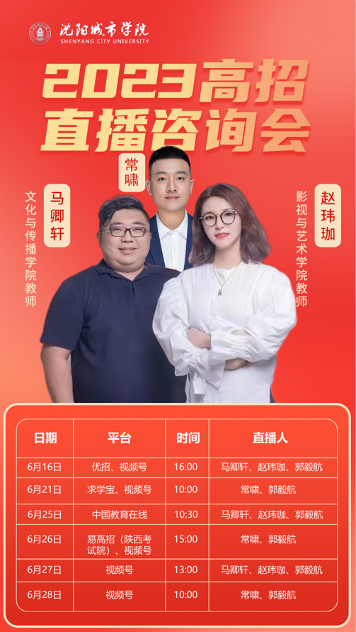 6月26日15:00,沈阳城市学院教师常啸、郭毅航将在易高招(陕西考试院)、沈阳城市学院视频号进行沈阳城市学院2023高招直播咨询会。