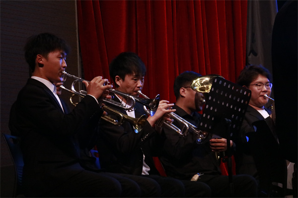 随后,一首气势磅礴的《红旗颂》将现场的气氛点燃,西洋管弦乐全体成员倾情演奏,铜管、单簧管、小号、打击乐和弦乐交织成一首壮丽的颂歌,当《红旗颂》的旋律响起,西洋管弦乐全体成员仿佛化身为音乐的使者,各声部在刘人豪老师的指挥、引导下和谐共鸣,激昂澎湃的旋律犹如滚滚江水,让人心潮澎湃。
