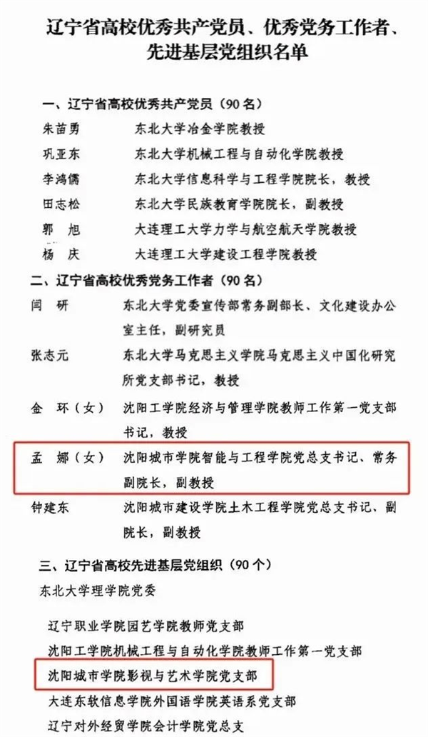 在庆祝中国共产党成立103周年之际,省委教育工委发布《关于表彰辽宁省高校优秀共产党员、优秀党务工作者和先进基层党组织的决定》,沈阳城市学院智能与工程学院党总支书记、常务副院长孟娜副教授被授予“辽宁省高校优秀党务工作者”荣誉称号,影视与艺术学院党支部被授予“辽宁省高校先进基层党组织”荣誉称号。