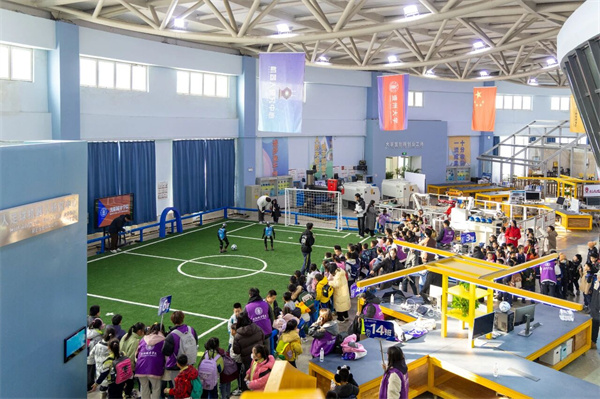 在大创工场的智能展区,足球机器人成为全场焦点。在老师的讲解下,同学们了解到,机器人全身23个精密关节的协同配合,让它们能在绿茵场上灵活地完成精准传球与射门。