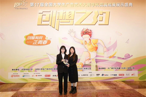 2025年12月6日,第17届全国大学生广告艺术大赛学科竞赛成果展示盛典在北京全国政协礼堂隆重举行。各省市教育厅代表、高校领导、行业领域专家、命题单位嘉宾以及来自全国百余所高校八百余名师生共同出席本次盛会,一同见证大广赛学科竞赛成果。我校获得国赛一等奖的刘芯彤团队获邀参加颁奖典礼。
