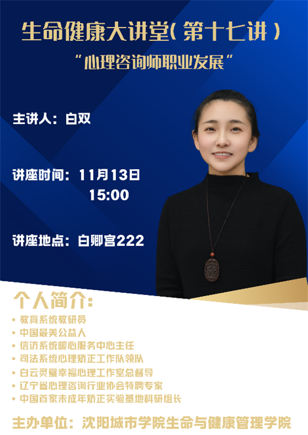 11月13日,生命与健康管理学院邀请信访系统暖心服务中心主任白双老师作为“生命健康大讲堂”系列学术讲座第十七讲的主讲人,在白卿宫222教室开展了题为《心理咨询师职业发展》的专题讲座。应用心理学专业师生参加了此次活动,讲座由应用心理学教师张东成主持。