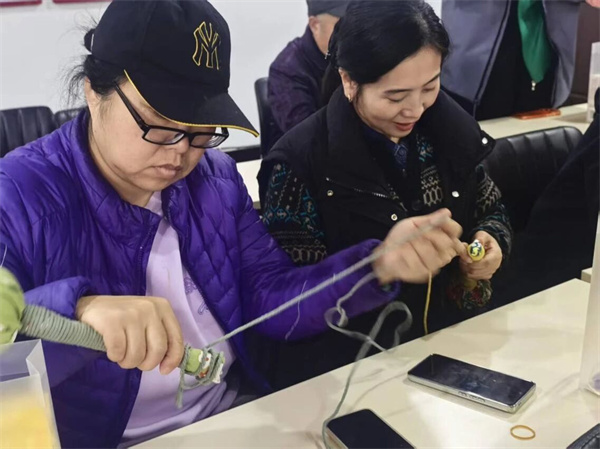 随着活动开始,手工制作区瞬间成为温暖据点——志愿者们挨着老人坐下,像家人般围聚。大家手把手教老人制作艾灸锤,填充艾草、固定锤头、缠绕棉线,动作细致又耐心;制作香囊时,一起挑选香料、缝制囊袋,老人们分享着生活见闻,志愿者们认真倾听,温馨互动中,一个个饱含心意的艾灸锤、香囊陆续完成,成为重阳专属的温暖信物。